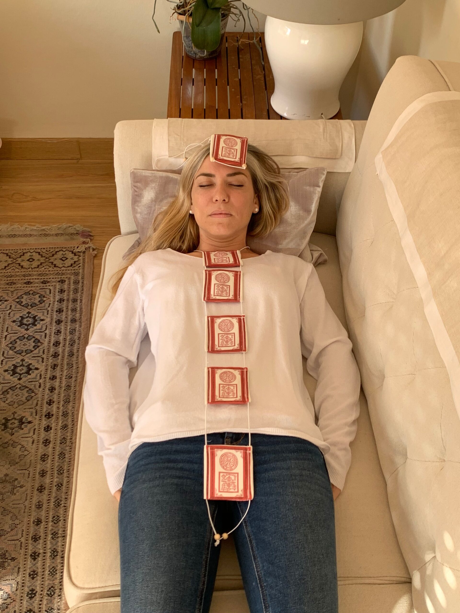 En reposo: Simplemente túmbate y alinea la corbata con tus chakras para que actúe de forma natural.
